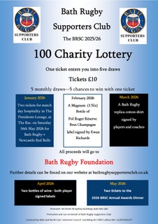 The BRSC 100 Charity Lottery gives you five chances to win with one ticket. Each ticket is entered into a monthly draw and the winner will win one of our fantastic prizes. The five draws take place in January, February, March, April and May 2026. All proceeds go the Bath Rugby Foundation.